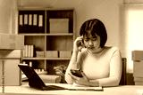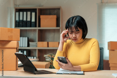 Young business woman having headache while using smartphone and managing online orders in warehouse