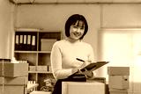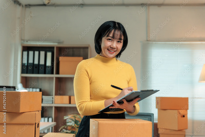 Young Asian woman entrepreneur checking order list on clipboard in warehouse, startup small business owner working at home office