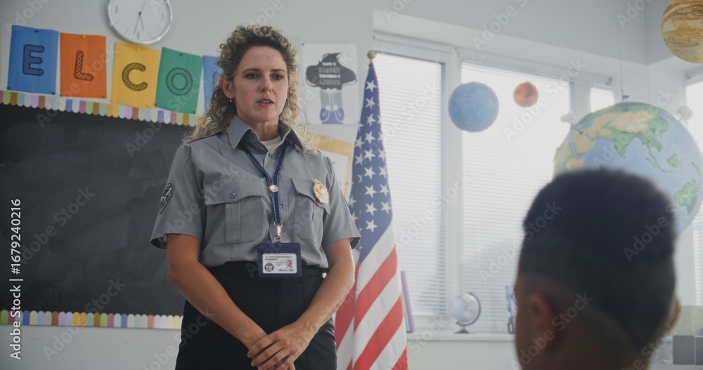 American Female Police Officer Visiting Classroom, Giving Lecture to Curious Primary School Students About Safety Rules. Young Kids Listening Attentively to Officer, Learning About Law and Protection.