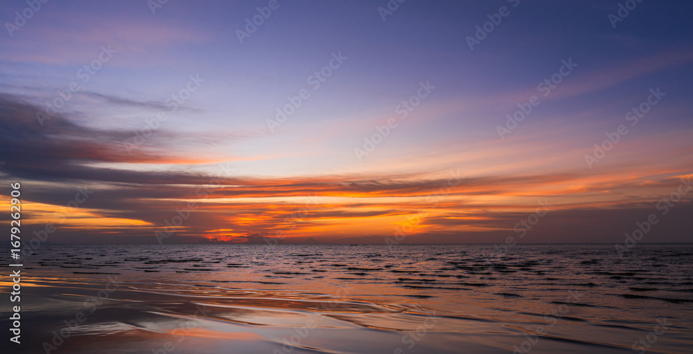Dusk Sky sunset clouds over Horizon sea landscape in the Evening Summer season Background, Dramatic Blue,Red, Orange,Yellow,Purple golden hour sunlight fluffy after sun dawn on Twilight sky background