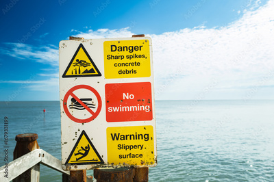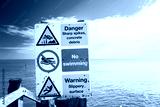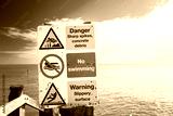 Shallow focus of a multiple hazard warning sign seen attached to a wooden pier near the North Sea. The area is prone to currents which may cause drowning.