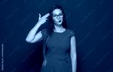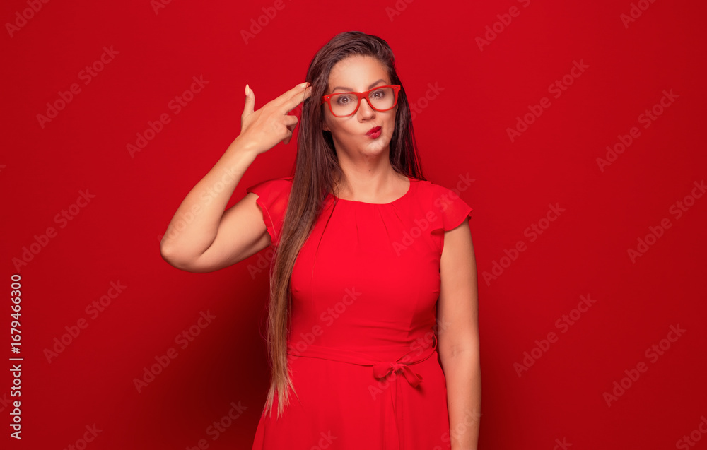 One woman makes finger gun gesture in temple, pretends committing suicide, isolated on red background.