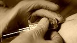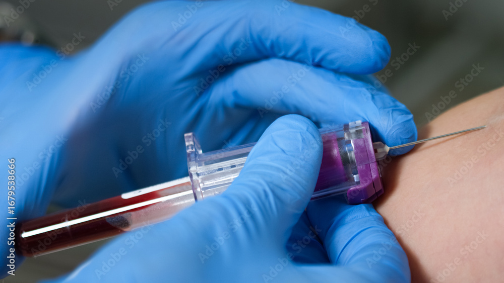 A healthcare professional collects a blood sample from a patient's arm using a syringe in a sterile environment.