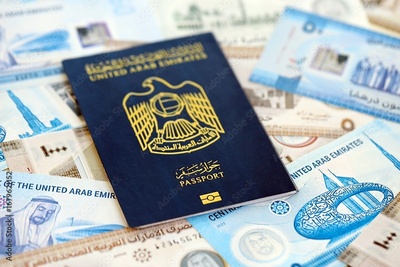 United Arab Emirates dirham currency money bills and passport. The concept of travel and vacation