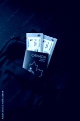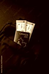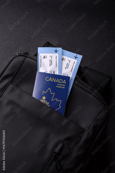 Passport Canada, visa for travel, document with tickets in travel bag. Canadian passport