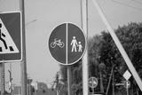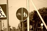 Traffic sign indicating bike lane and pedestrian area in urban setting, encouraging safe travel for families