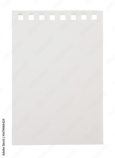 Torn-out empty white notebook page, visible binder holes on top edge, isolated on transparent background. Empty note paper mockup. Writing, notes, school organization concept, cut out graphic object