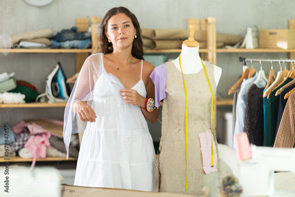 Skilled young female fashion designer fitting linen dress on mannequin in modern dressmaker studio, carefully adjusting seams and checking shape surrounded by sewing machines and racks of clothes