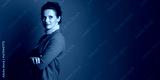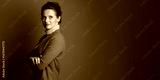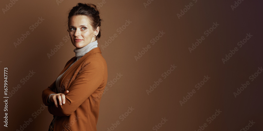 A professional adult businesswoman in a brown blazer and beige turtleneck stands with arms crossed, looking confidently at the camera in this medium close-up studio portrait.