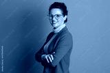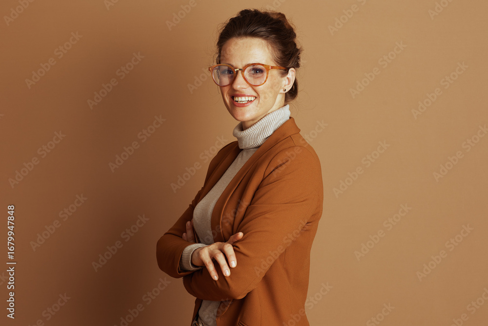 A smiling professional woman in glasses and a brown blazer stands with crossed arms, radiating confidence and approachability, perfect for executive and leadership themes.