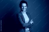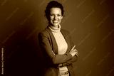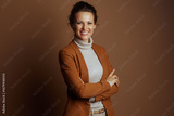 A confident businesswoman with a warm smile and arms crossed, wearing a brown blazer and beige turtleneck, looks directly at the camera against a solid brown studio background.