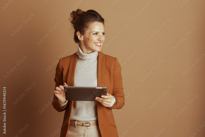 A smiling woman in brown blazer and beige turtleneck engaged with dark grey digital tablet horizontally. Her focused gaze suggests thoughtful interaction with digital content in professional setting