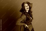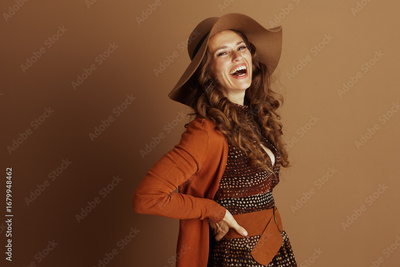 A confident woman with a wide smile, wearing a rust-colored cardigan, patterned dress, and floppy hat, poses elegantly with one hand on her hip against a simple brown background.