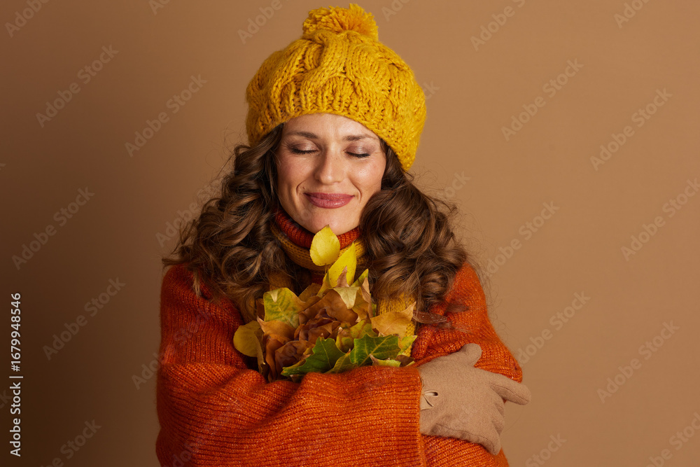 A woman with curly brown hair and closed eyes, dressed in an orange sweater, yellow pom-pom hat, and gloves, holds a bouquet of colorful autumn leaves.