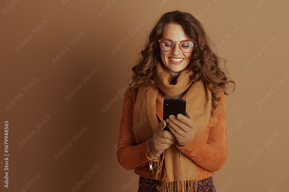 A smiling woman with curly brown hair and glasses wears an orange jacket, camel scarf, and gloves. She looks down, engaged with a black smartphone she holds against a plain brown background.