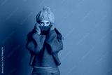 Playful woman in knit hat and oversized orange turtleneck pulls sweater collar up with gloved hands, partially hiding face while looking at camera. This image captures cozy autumn or winter warmth