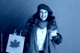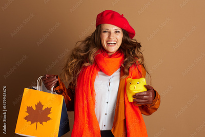 A joyous woman in autumn attire, including red beret and orange jacket, laughs while holding shopping bag with maple leaf and yellow piggy bank, symbolizing seasonal retail and financial prudence