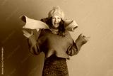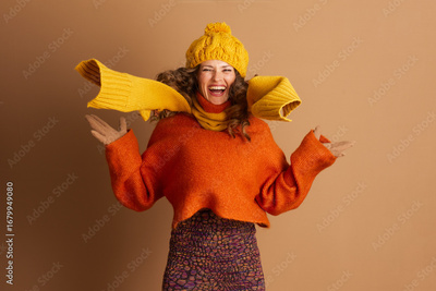 A joyful woman with curly brown hair is captured mid-jump, arms outstretched, scarf billowing. She wears a yellow beanie, scarf, orange sweater, and patterned skirt against a light brown background.