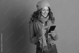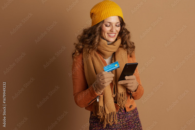 A smiling woman in a yellow beanie and orange jacket holds a smartphone and credit card, representing the ease of online shopping and mobile financial transactions in warm autumn light.