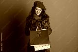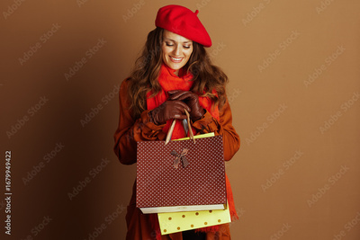 Smiling woman with wavy brown hair, red beret, orange coat, and scarf, looks down contentedly, holding two festive polka dot shopping bags. Warm background embodies post-shopping satisfaction.