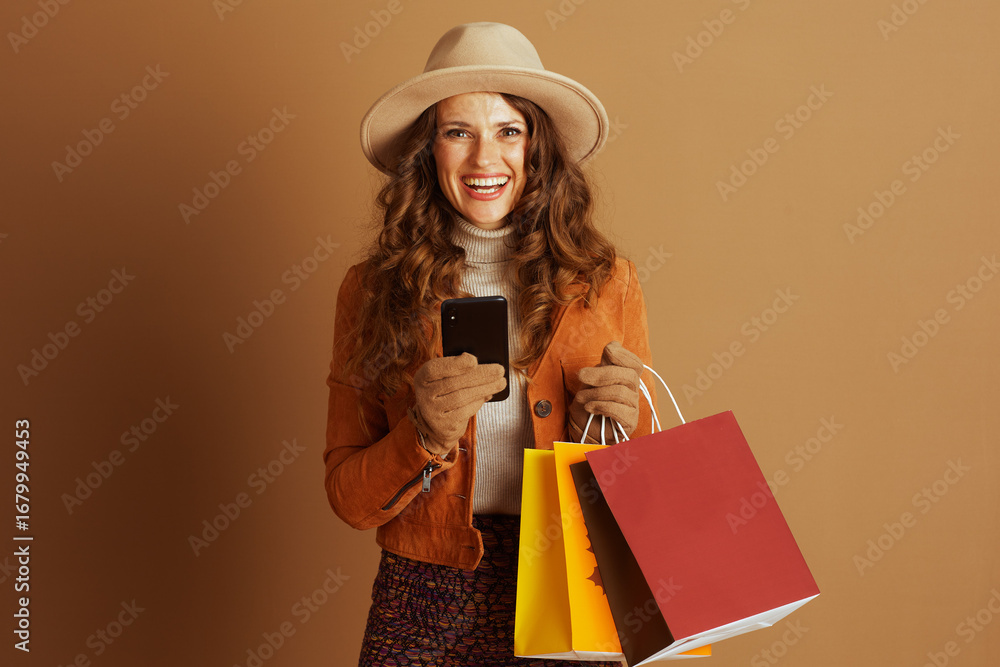 Smiling woman in chic autumn attire holds smartphone and shopping bags, reflecting modern blend of fashion, technology, and leisure against plain brown background.