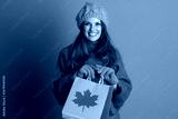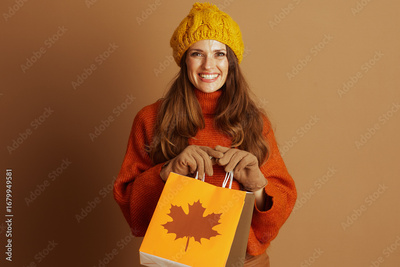 A smiling woman in yellow hat and orange turtleneck, holding autumn-themed shopping bag, poses against warm brown background. This portrait conveys cheerful, fashionable seasonal shopping mood