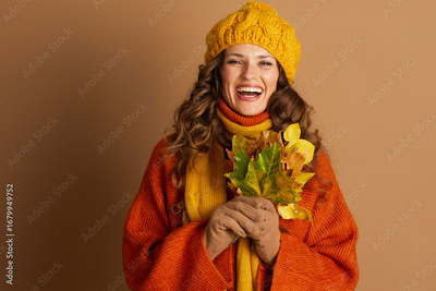 Smiling woman with long, curly brown hair, wearing an orange sweater and yellow scarf, holds a bunch of autumn leaves. This medium close-up captures her happiness and the warmth of the fall season.