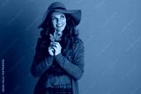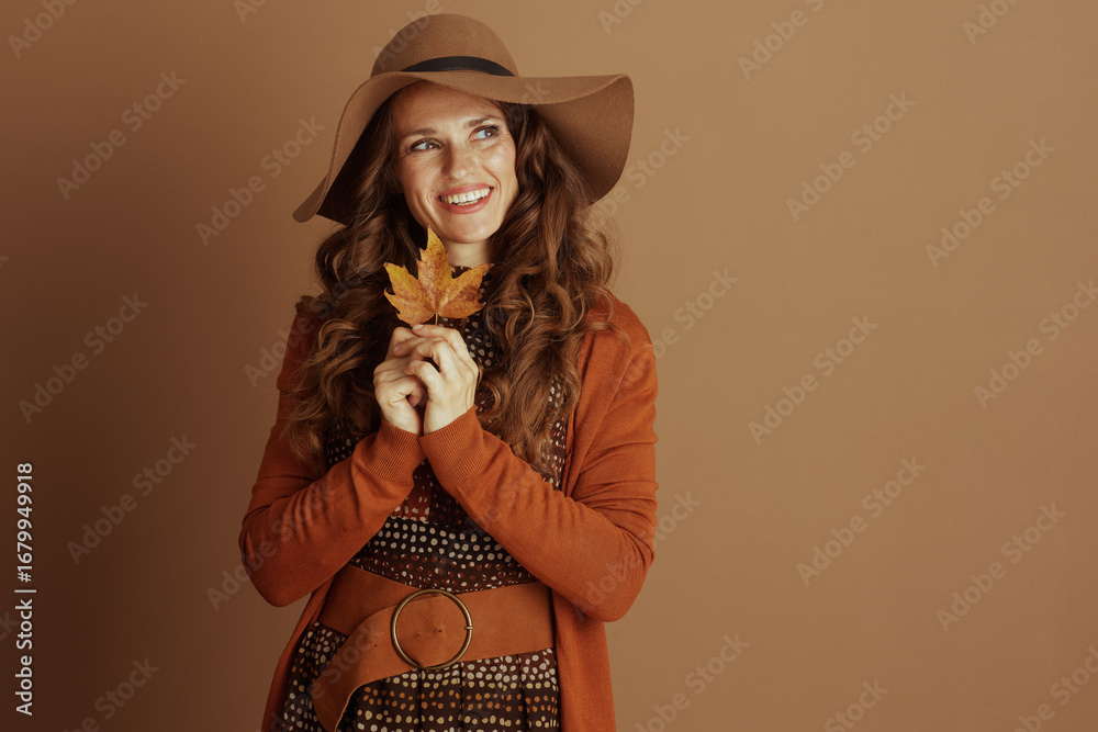 A smiling woman in a wide-brimmed hat and orange cardigan holds a yellow autumn leaf in clasped hands, gazing upwards with contentment against a warm brown backdrop.