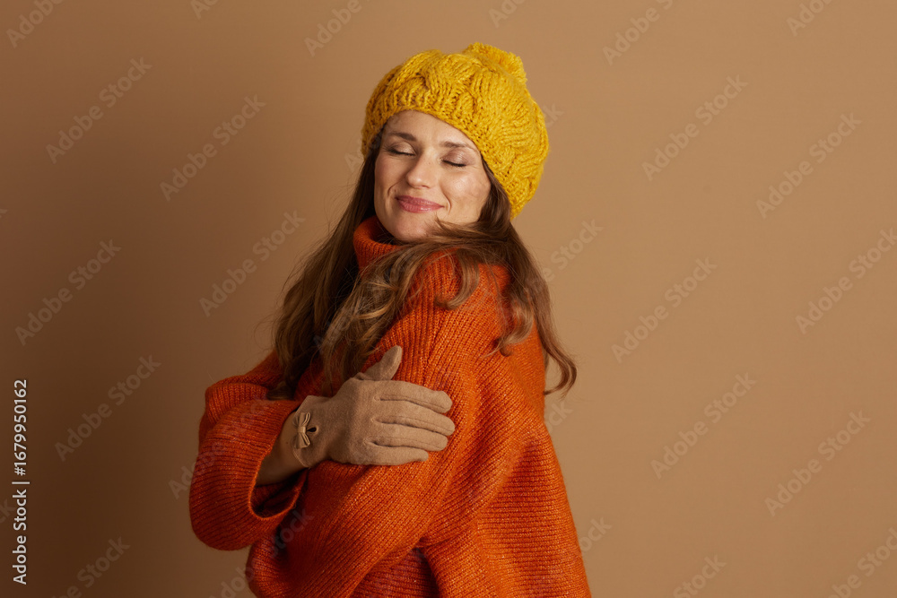 A contented woman with long brown hair, in an oversized orange turtleneck and yellow beanie, closes her eyes with a gentle smile, embracing serene comfort.