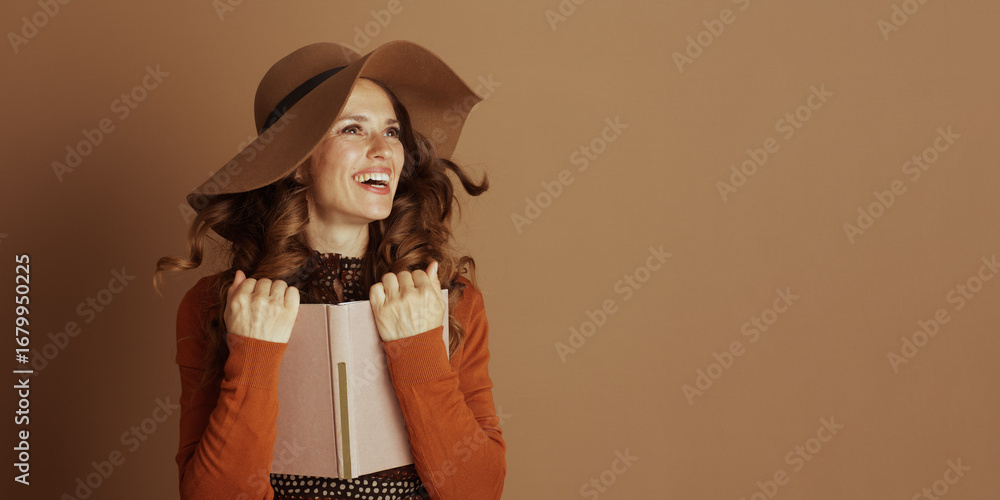 A smiling woman in an orange cardigan and wide-brimmed hat clutches a pink book to her chest, looking upwards with an animated and joyful expression against a brown background.
