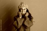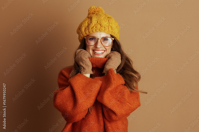 A cheerful young woman in orange chunky knit turtleneck sweater, yellow beanie, and fingerless gloves smiles warmly at camera. She embodies cozy autumn or winter mood against plain brown background