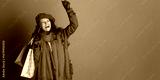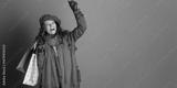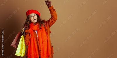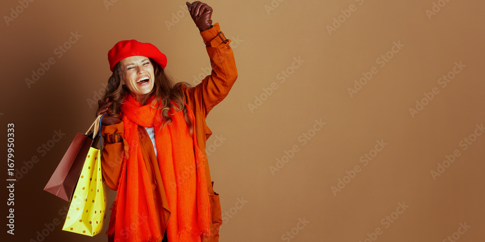 Woman in red beret and coat laughs joyfully, her arm raised in celebratory fist pump. Holding two shopping bags against plain brown backdrop, she conveys excitement and triumph in autumn shopping