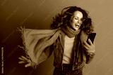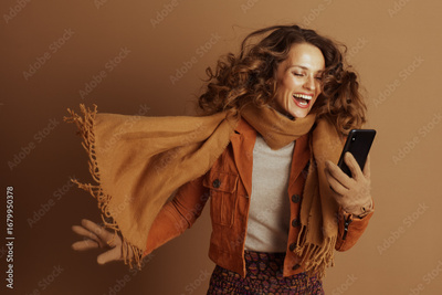 A woman with curly brown hair radiates happiness as she laughs while looking at her smartphone, dressed in a vibrant orange jacket and warm autumn accessories against a tan background.