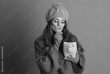 A contemplative woman in orange sweater and yellow beanie poses with piggy bank, hand on chin and lips pursed. She thoughtfully examines her savings, reflecting on financial planning in soft light