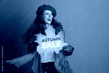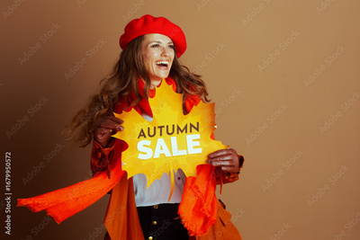A lively woman in a red beret and orange coat, laughing with joy, holds a large yellow autumn leaf sign announcing an "Autumn Sale," capturing the excitement of seasonal shopping.