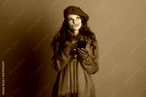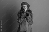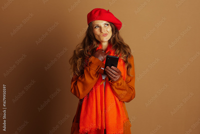 A woman in stylish autumn wear, including a red beret and orange scarf, holds a smartphone with a thoughtful, slightly skeptical expression. This studio shot suggests contemplation or decision-making.
