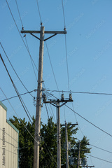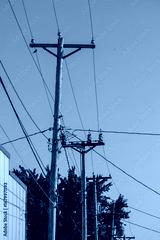 high voltage power lines against blue sky