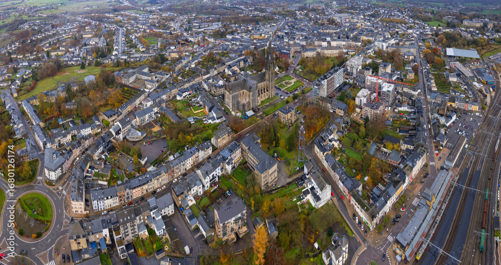 An Aerial panorama view of the old town of the city Arlon in Belgium,. on a cloudy day in Autumn
