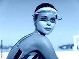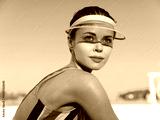 Close-up portrait of a sunlit athlete on a sandy beach, wearing a colorful striped swimsuit and pink visor, glancing over the shoulder with a confident, relaxed expression.