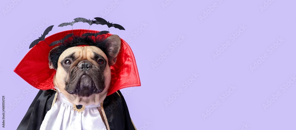 Cute bulldog dressed as vampire for Halloween party on purple background with space for text