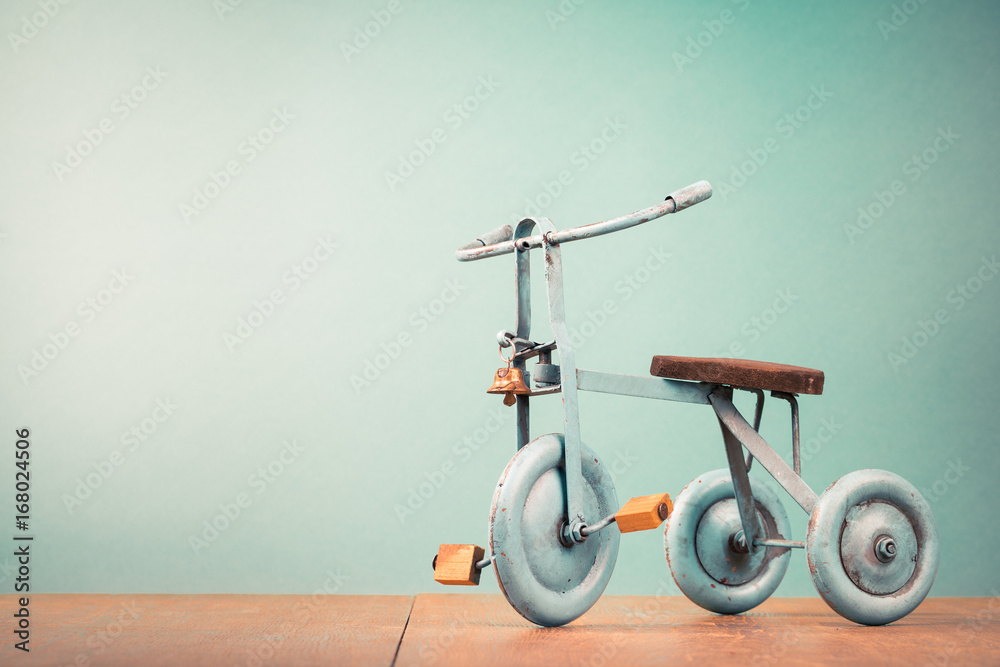 Old retro toy bicycle with three wheels. Vintage instagram style filtered photo