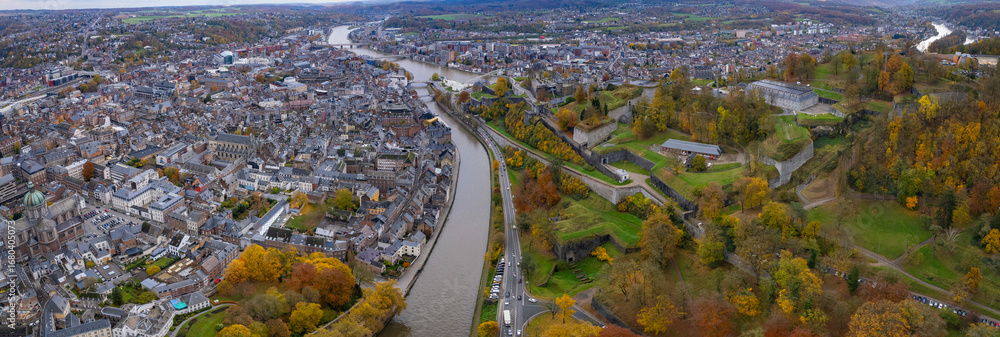 An aerial panorama view around the downtown of the City Namur In Belgium on a cloudy spring afternoon