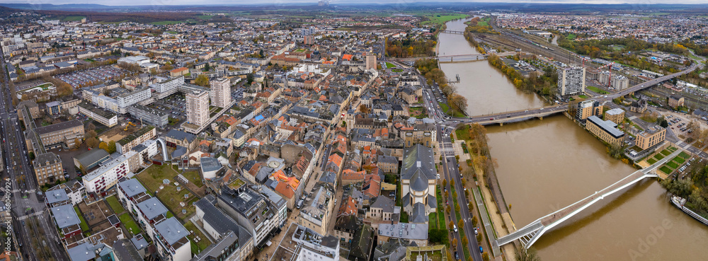 An aerial panorama view around the downtown of the City Thionville In France on a cloudy spring noon