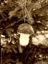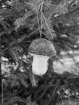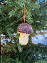 Hobby. Christmas tree toys made of cotton wool. Mushroom.