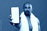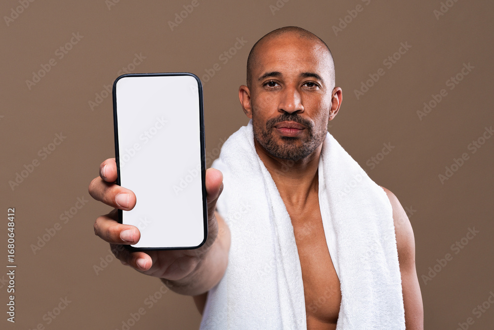 Beauty portrait of middle-aged hispanic black handsome man holding cellphone with blank screen to insert advertisement
