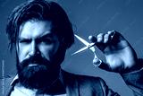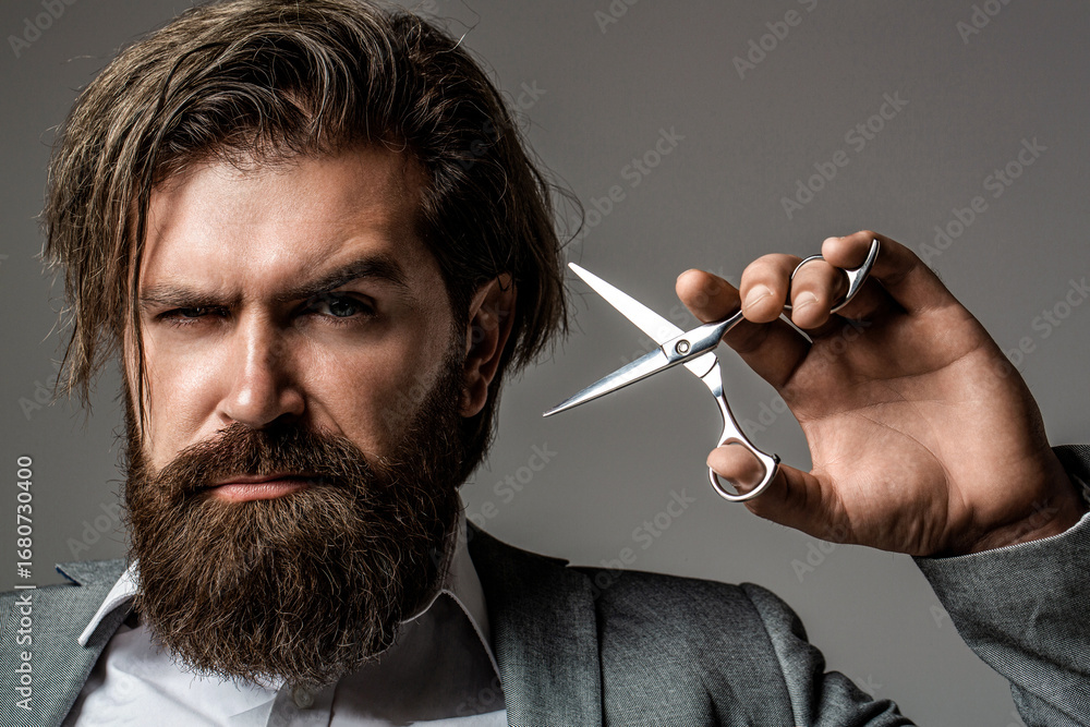Barber scissors. Vintage barbershop, shaving. Male in barbershop, haircut, shaving. Mens haircut in barber shop. Barber scissors, barber shop