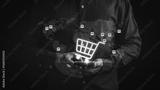 Digital shopping cart icon with global map and network connection, symbolizing e-commerce, online retail, worldwide business, shopping online, internet marketing and global digital trade concept.