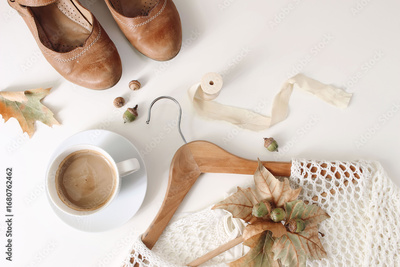 Autumn flatlay with leather shoes, coffee cup, wooden hanger, knitted sweater, acorns and dried leaves isolated on white background. Cozy fashion scene, neutral tones. Fall lifestyle composition, top