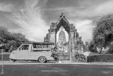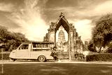 Young asian female traveler with backpack traveling sitting on taxi or Tuk Tuk and see map travel with old temple (Wat Mahathat) background, Ayutthaya Province, Thailand