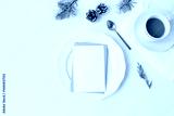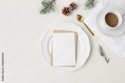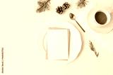Christmas holiday festive greeting cards mockup. Ceramic plate, golden spoon,cup of coffee isolated on white background. Pine cones, cedar, fir tree branches decor. Winter table setting. Fat lay, top